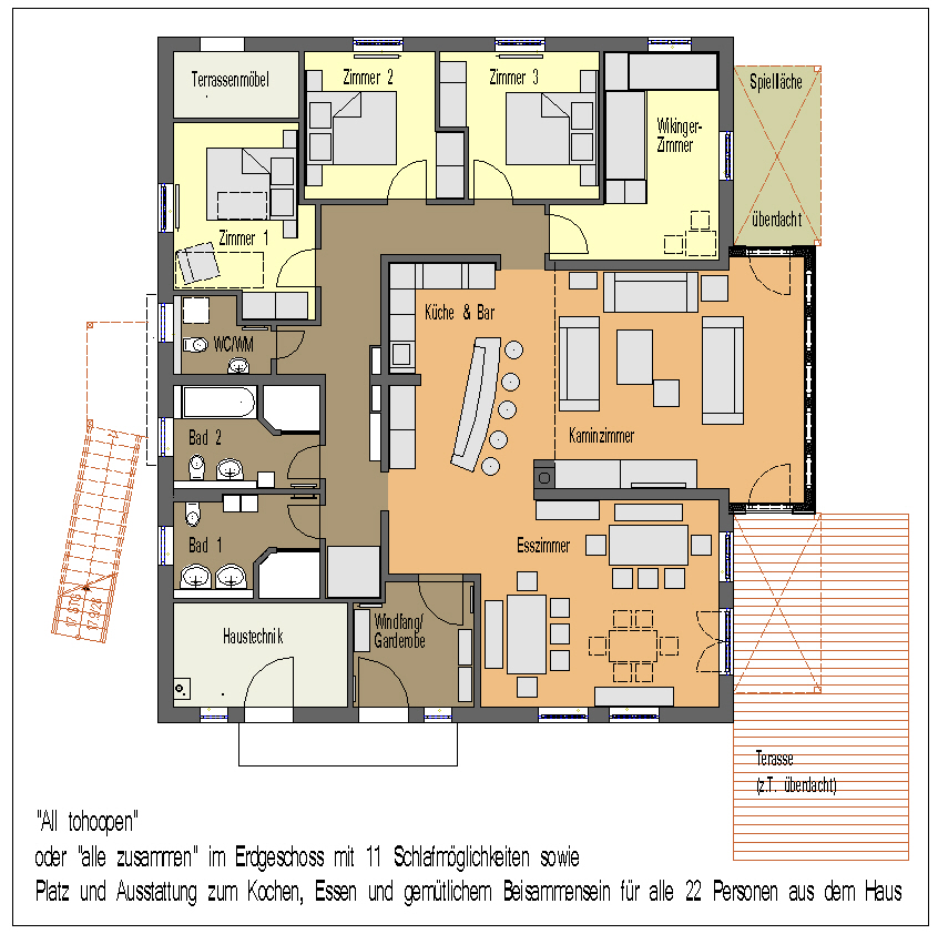 Wir haben in dieser Wohnung großzügige Aufenthaltsräume geschaffen, die soviel Platz bieten, dass man selbst bei Komplettbuchung des Hauses mit bis zu 22 Personen
